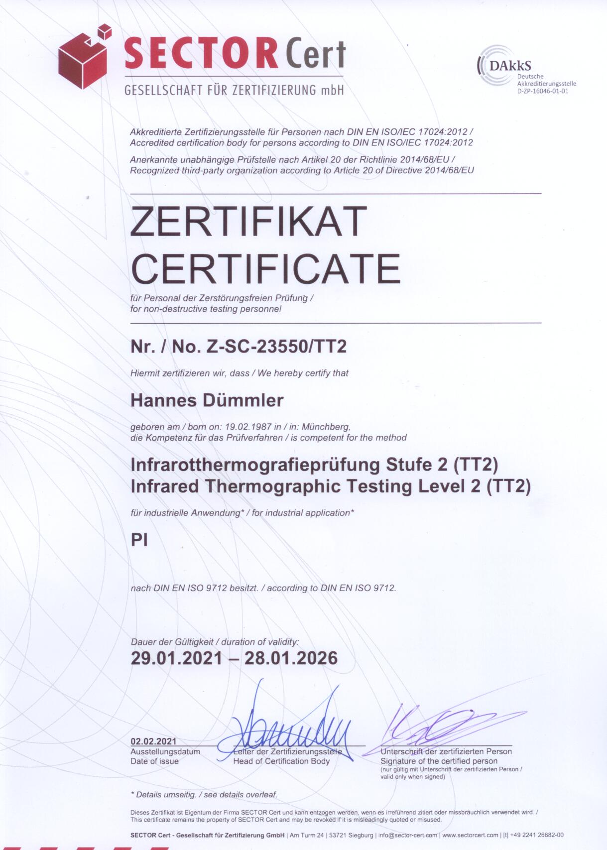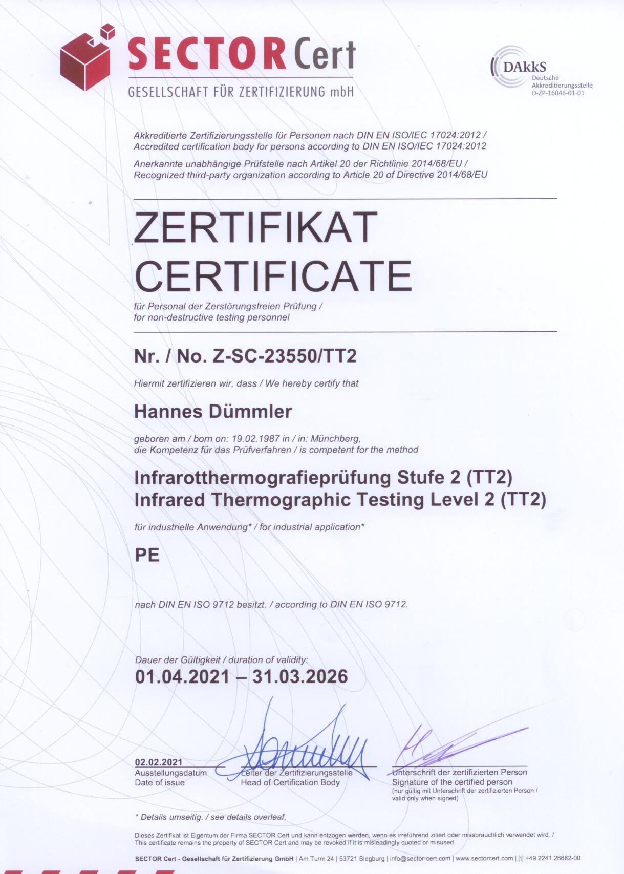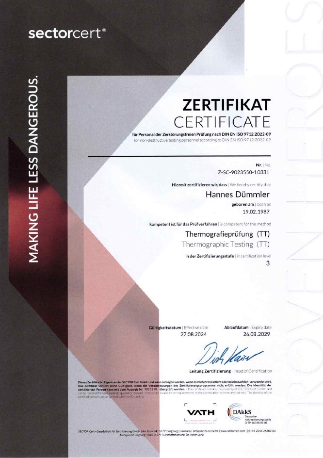 - Zertifizierter Thermograf nach DIN EN ISO 9712 Stufe 2 Sektor Elektro, Industrie sowie Stufe 3 MA