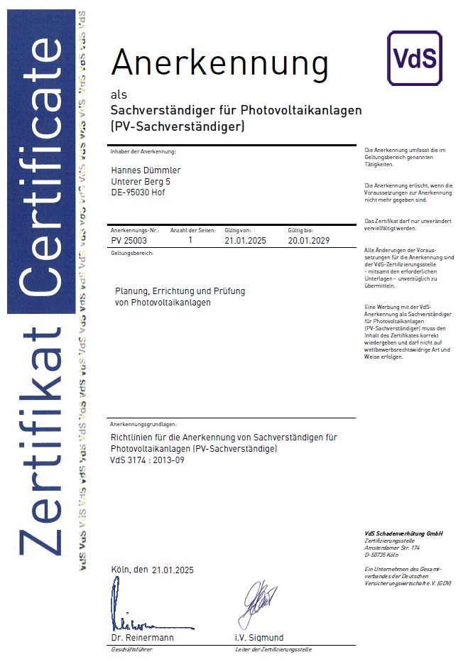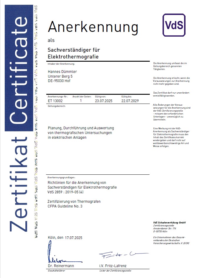 - VdS-anerkannter Sachverständiger für Elektrothermografie