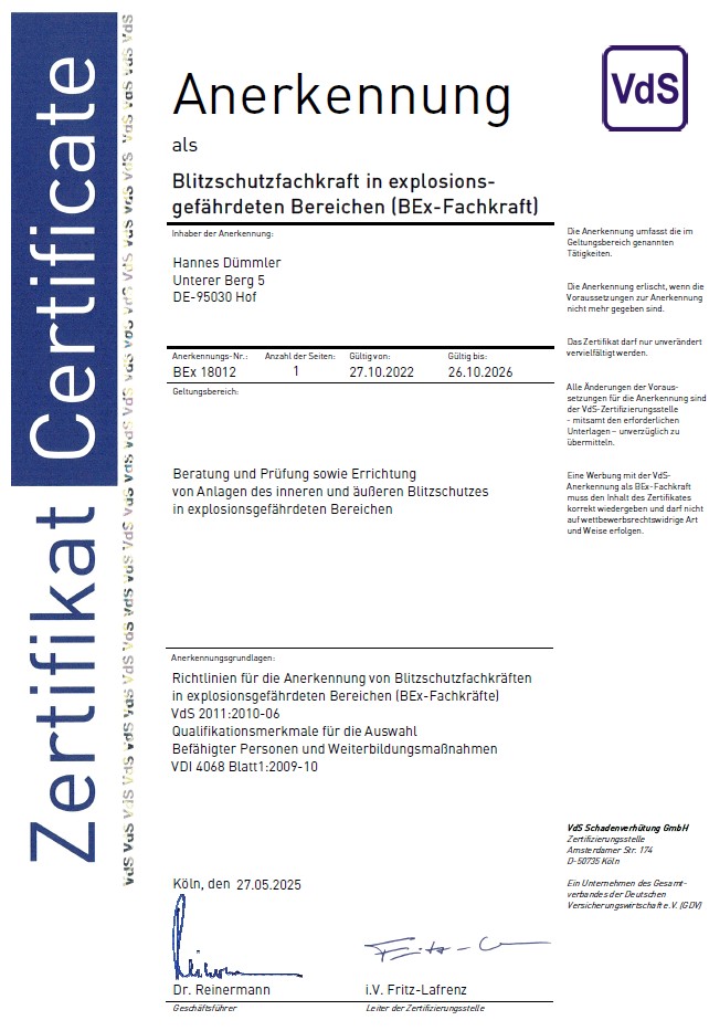 - VdS-anerkannte Blitzschutzfachkraft in explosionsgefährdeten Bereichen