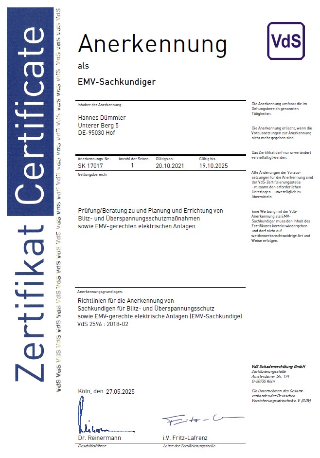 - VdS-anerkannter Sachkundiger für EMV sowie Blitz- und Überspannungsschutz